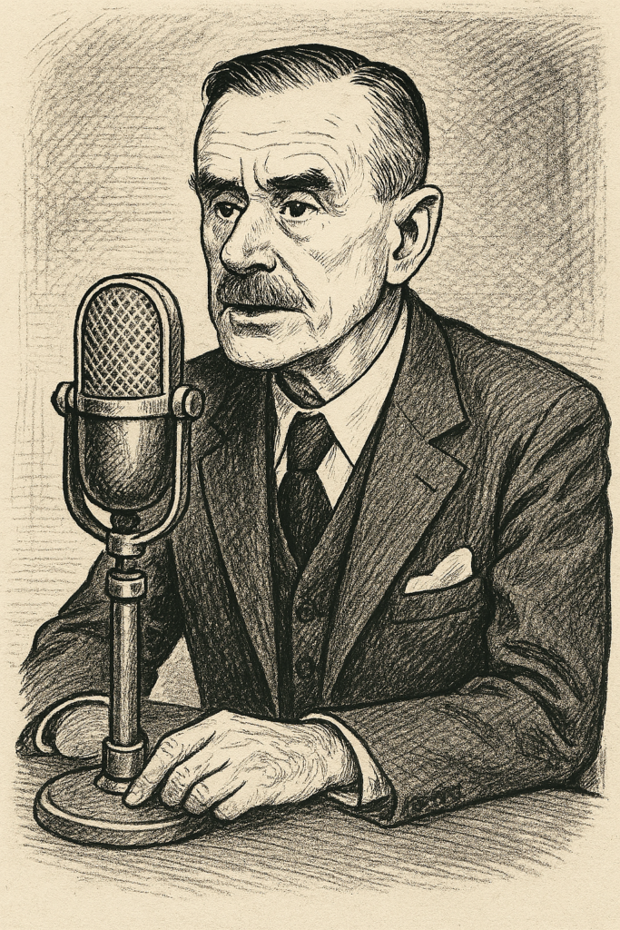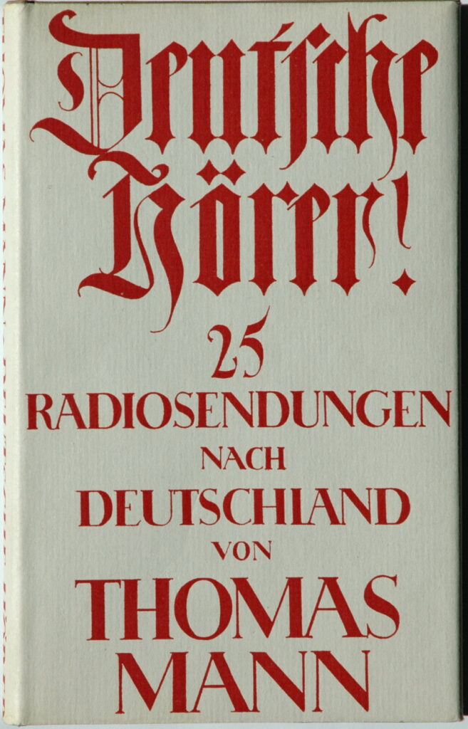 | Thomas Mann: Deutsche Hörer! Radiosendungen nach Deutschland, Neuausgabe mit einem Vorwort und einem Nachwort von Mely Kiyak, S. Fischer Verlag, Frankfurt 2025, 272 S., EUR 24,00. Caren Heuer, Barbara Eschenburg (Hrsg.): Meine Zeit, Thomas Mann und die Demokratie, Verlag Königshausen & Neumann, Würzburg 2025, 212 S., EUR 24,00. Audio-Aufnahmen (Auswahl): Deutsche Hörer! Radioansprache Thomas Manns vom 3. August 1943: https://archive.org/details/Thomas-Mann-Deutsche-Hoerer/Thomas+Mann+-+Deutsche+H%C3%B6rer+3+-+August+1942.mp4 Weitere Beispiele von „Deutsche Hörer“, Thomas Mann im Original: https://www.swr.de/swrkultur/wissen/archivradio/thomas-mann-meldet-sich-aus-kalifornien-102.html „Meine Zeit“ – Rede Thomas Manns im Originalton: https://www.swr.de/swrkultur/wissen/archivradio/meine-zeit-thomas-mann-blickt-1950-auf-sein-leben-zurueck-100.html |