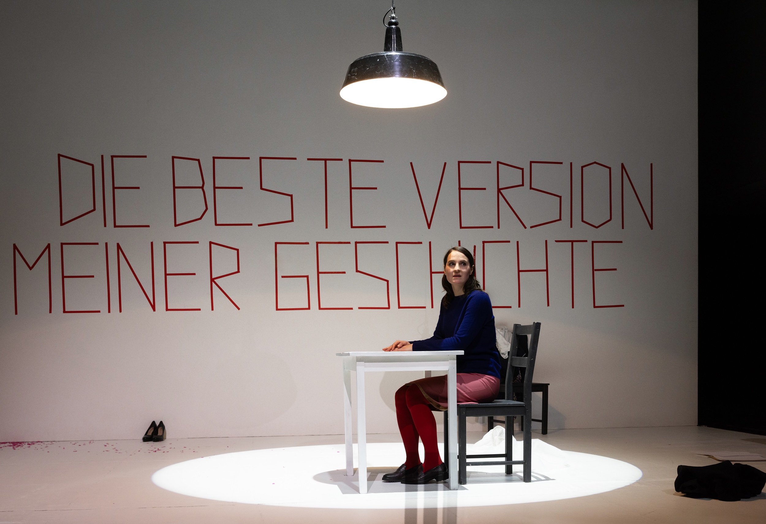 Nina Mattenklotzs Schweriner Inszenierung skizziert bereits durch das Bühnenbild den schwierigen Begriff der „juristischen Wahrheit“, der im besten Fall als radikal konstruktivistisch gelten kann: Jennifer Sabel in der Rolle der Tessa Ensler agiert auf einem weißen Bühnenrechteck. „Die beste Version der Geschichte“ ist hinter ihr auf der weißen Wand zu lesen. Das Dilemma, das sich für Tessa Ensler im Verlauf des Stückes entwickelt, ist kaum treffender auf den Punkt zu bringen: Die traumatisierende Erfahrung sexualisierter Gewalt ist zwar ein Erlebnis höchster Realität, im Gericht wird sie aber zu einer möglichen Version von Wirklichkeit degradiert, die mit anderen Narrationen um die größtmögliche Glaubwürdigkeit konkurriert.