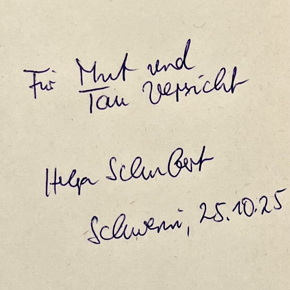 Die Zuhörer*innen in der Schlossbibliothek sind fasziniert. Was macht ihre Geschichten heute so populär, die seit der Verleihung des Ingeborg-Bachmann-Preises 2020 in dichter Folge erscheinen oder wieder neu aufgelegt werden? „Es gibt immer einen Ausweg, eine Rettung, selbst in der scheinbar ausweglosesten Situation“, beschreibt Helga Schubert ihr Credo und appelliert an ihre Leser*innen, Zuversicht zu pflegen. „Mut“ und plattdeutsch „Tauversicht“ sind auf die beiden Tonkacheln geritzt, die bei jeder Mahlzeit neben ihrem und dem Teller ihres Mannes lagen. Der Pastor hatte sie ihnen geschenkt. Er erkannte, worin das Geheimnis von Helga Schuberts Literatur liegt: An sich zu glauben, eine noch so verzweifelte Situation mit Kraft, mit sehr viel Kraft, Mut und vor allem mit Glaube, Hoffnung und Liebe meistern zu können. Ganz wichtig: den Humor nicht vergessen.