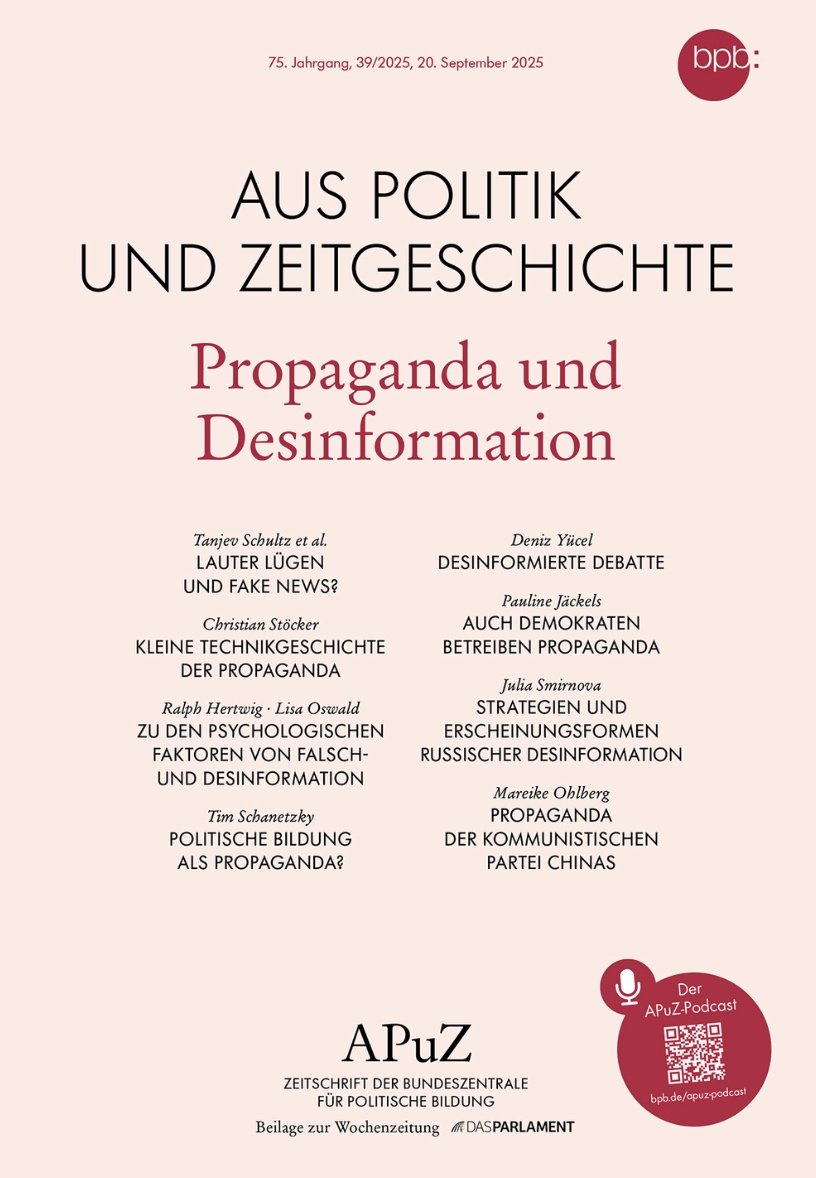 Weitere Beiträge befassen sich mit psychologischen Faktoren für das Glauben von Falsch- und Desinformation, mit der Rolle der Bundeszentrale für politische Bildung in der Geschichte der Bundesrepublik, mit der Propaganda seitens demokratischer Staaten sowie mit den Propagandaaktivitäten Russlands und – weniger beachtet, aber nicht weniger wirksam – Chinas.