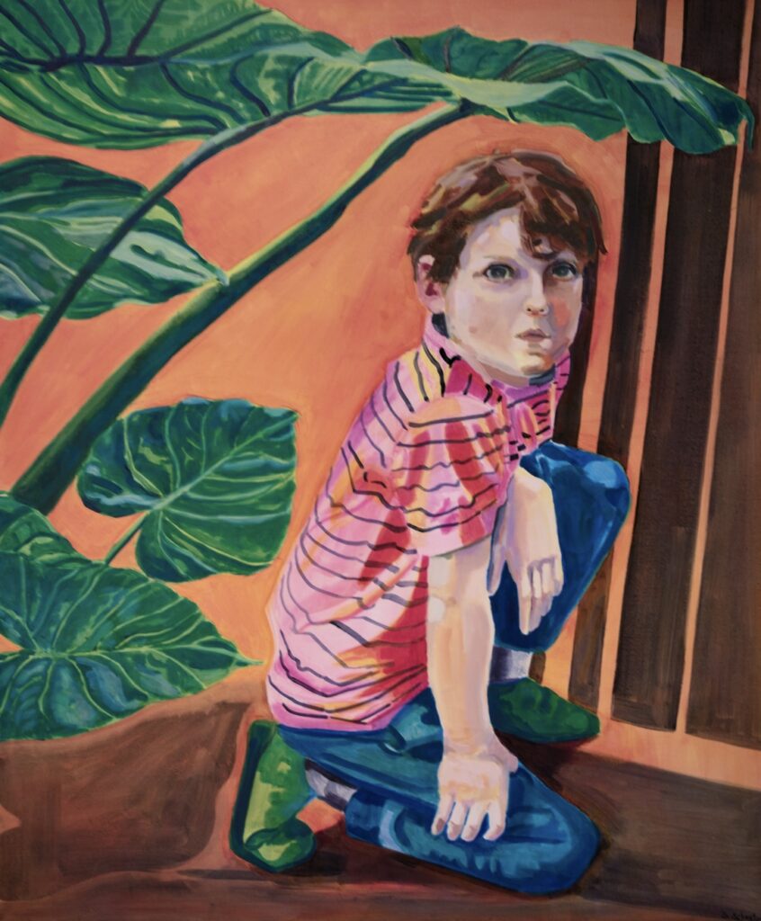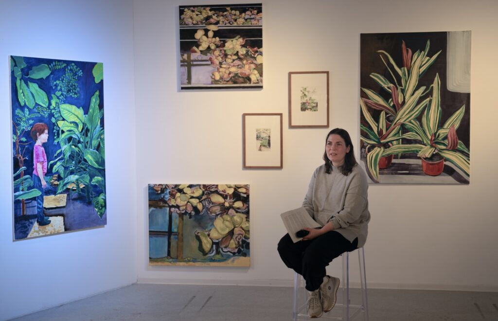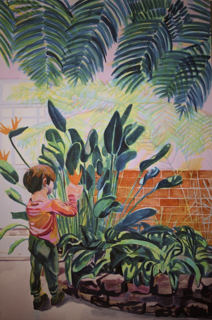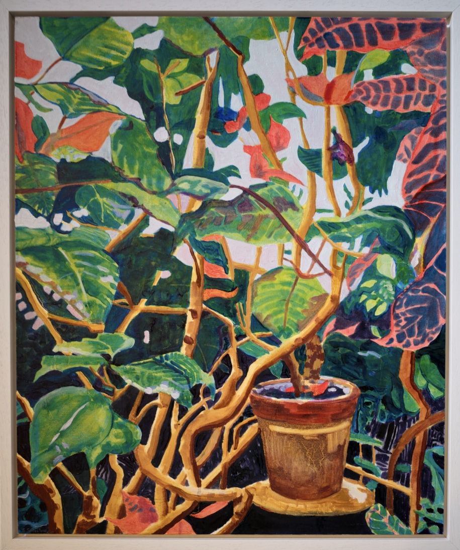 Das zentrale Motiv ihrer Gemälde sind großblättrige Pflanzen, die den Bildraum dominieren, ohne sich dem Betrachter aufzudrängen. Die harmonische Farbgebung erzeugt eine mimetische Wirkung, die an die Präsenz echter Pflanzen erinnert: Sie fördern Achtsamkeit, bauen Stress ab und verlangsamen das Zeitempfinden – vorausgesetzt, man versteht den Menschen als biophiles, also der Natur zugeneigtes Wesen.