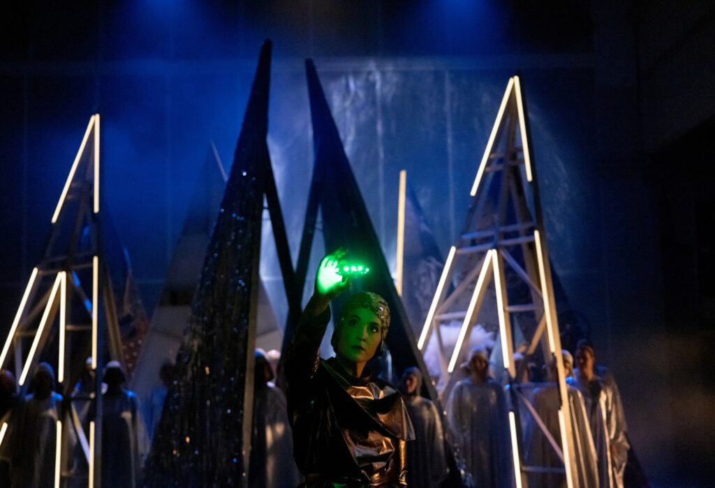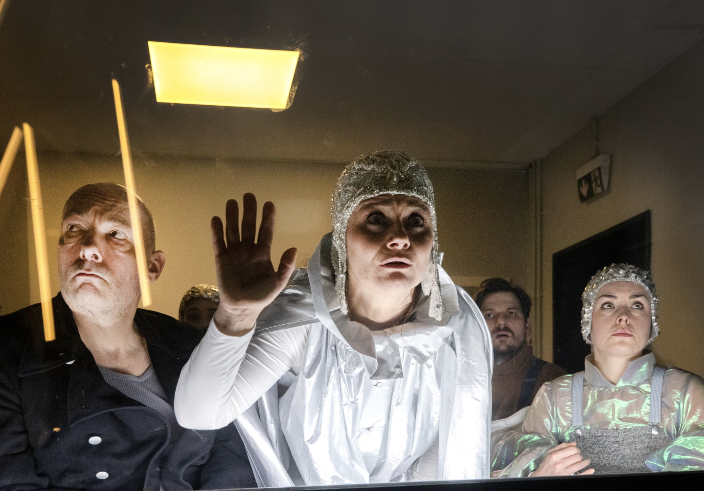 „Sterni und die Astronauten” wird in einem Science-Fiction-Kontext verortet. Die Schauspieler*innen tragen von Magdalena Musial treffend entworfene Kostüme, die an eine Star Wars-Persiflage erinnern. Magdalena Musial zeichnet auch für die Bühne verantwortlich, sie weiß diese mit allerhand Retro-Science-Fiction-Chick auszugestalten. Jan Speckmann ist erneut verantwortlich für die Live-Video-Sequenzen, die das per Handkamera eingefangene Geschehen auf und neben der Bühne überlebensgroß projizieren. Diese Sequenzen erweitern den Blick der Zuschauenden um eine weitere Perspektive. Und diese Perspektiverweiterung ist ein zentraler Topos des Stückes. Die Bestandsaufnahme ist eine ernüchternde: Die Zeit der Utopien sei vorbei, realisierte gesellschaftliche Utopien hätten sich geschichtlich zu Dystopien verkehrt.